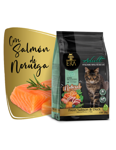 L'aliment ERA Saumon et Canard est un aliment complet pour chats de toutes races, fabriqué sans céréales, ce qui le rend idéal pour les personnes intolérantes ou allergiques à certains ingrédients. Ce produit est préparé avec des ingrédients et des ingrédients fonctionnels soigneusement sélectionnés, notamment des probiotiques inactivés, des antioxydants naturels, du zinc et des vitamines. Tous contribuent à renforcer le système immunitaire. L'aliment sans céréales ERA pour saumon et canard contient des ingrédients fonctionnels tels que la taurine, des plantes et des fruits rouges riches en bioflavonoïdes, qui favorisent la protection cardiovasculaire. De plus, il contient de la lignocellulose, une fibre soluble qui contribue à améliorer la digestibilité et à contrôler la formation de boules de poils. De même, grâce à la présence de l'algue « Ascophyllum nodosum », riche en phlorotanins et en acide alginique, l'hygiène dentaire de votre chat est protégée. Il s'agit d'un aliment sans céréales, idéal pour les chats souffrant d'allergies ou d'intolérances et pour faciliter la digestion des chats ayant l'estomac sensible.
