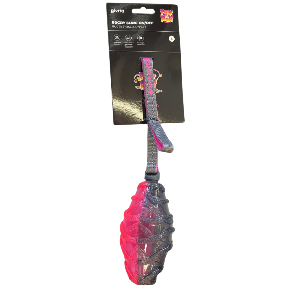 Balle ovale à poignée avec couineur amovible. Il suffit de tirer la partie grise avec « d’enlever » ou de « remettre » le couineur