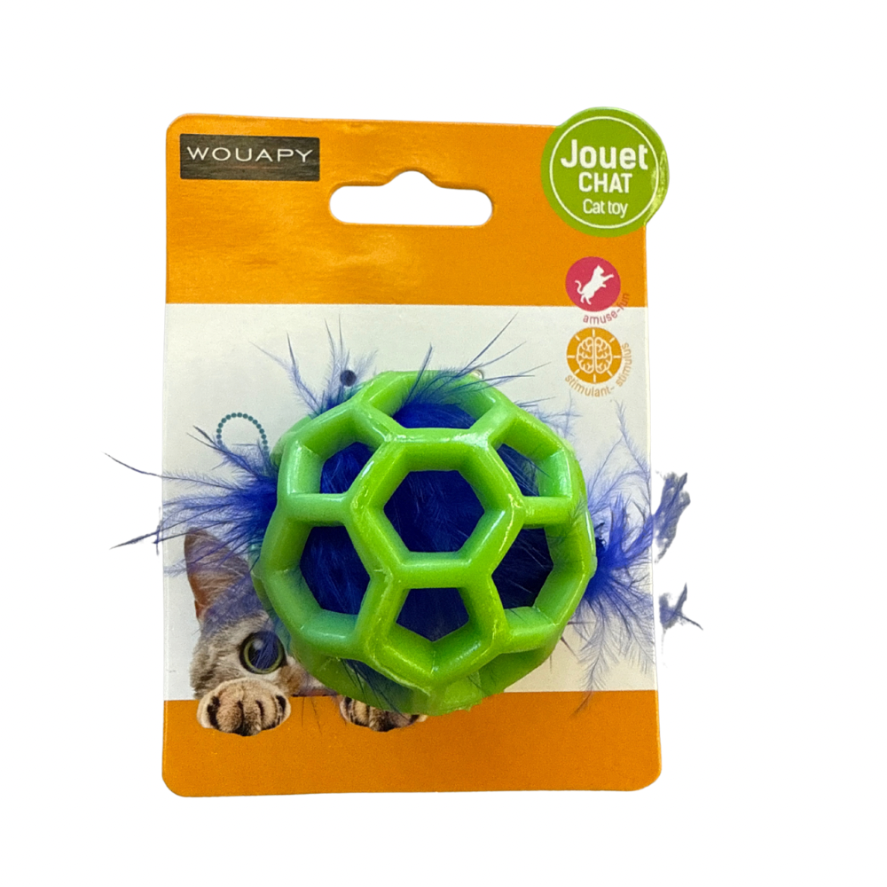 Balle en TPR avec plumes, creuse d’occupation pour chat et chaton.