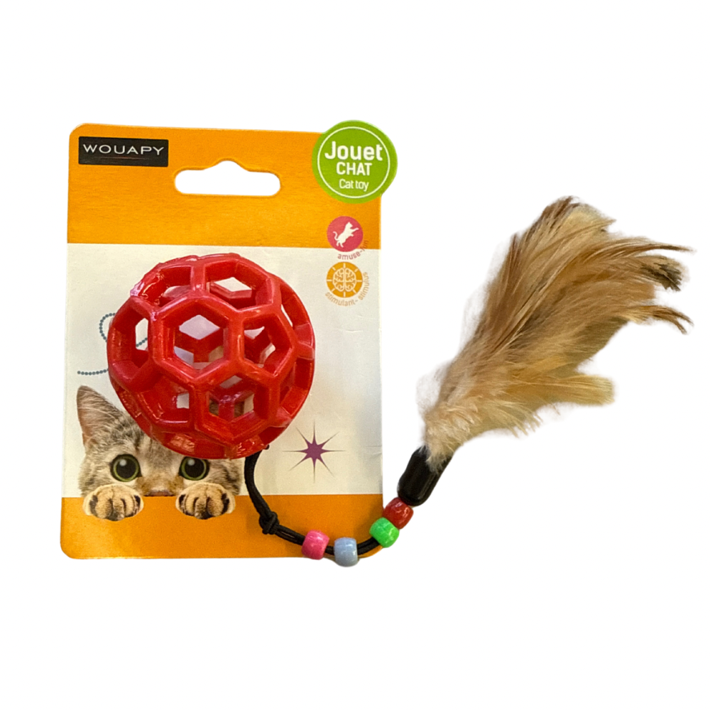 Balle en TPR avec queue en perle et plumes, creuse d’occupation pour chat et chaton.