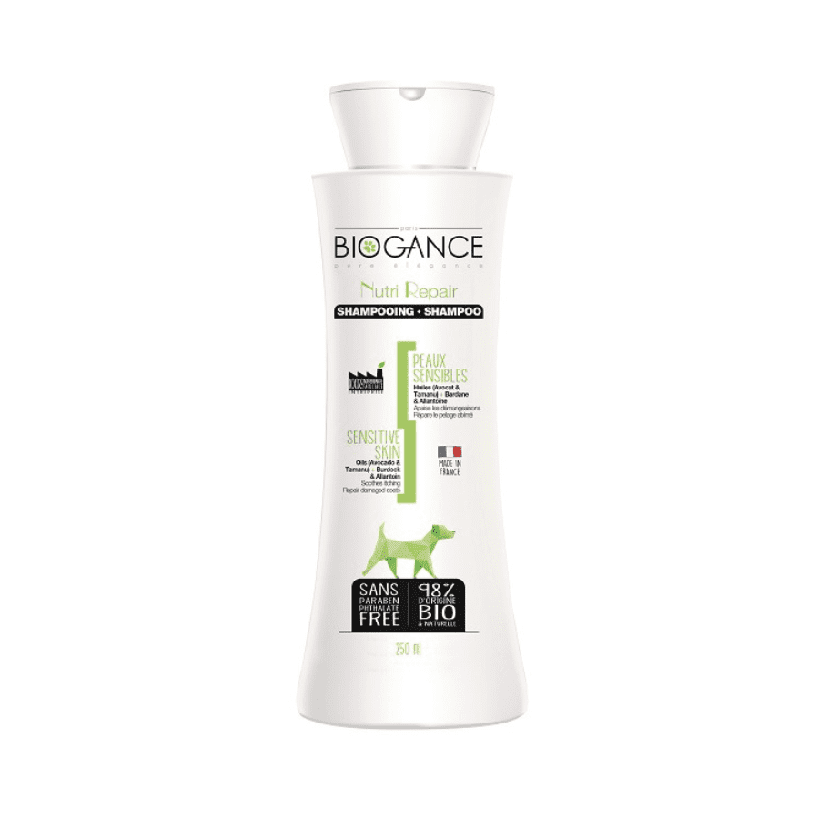 Le shampooing Nutri Repair spécial peau sensible pour chien est formulé à base d’huile d’avocat, de tamanu, de bardane et d’allantoine.