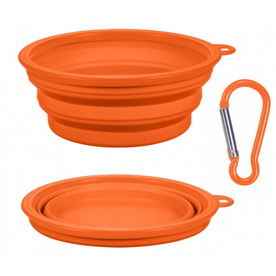 Gamelle pliable en silicone avec mousqueton et couvercle en plastique. Idéal pour les longs trajets ou afin de conserver une ration de croquette.