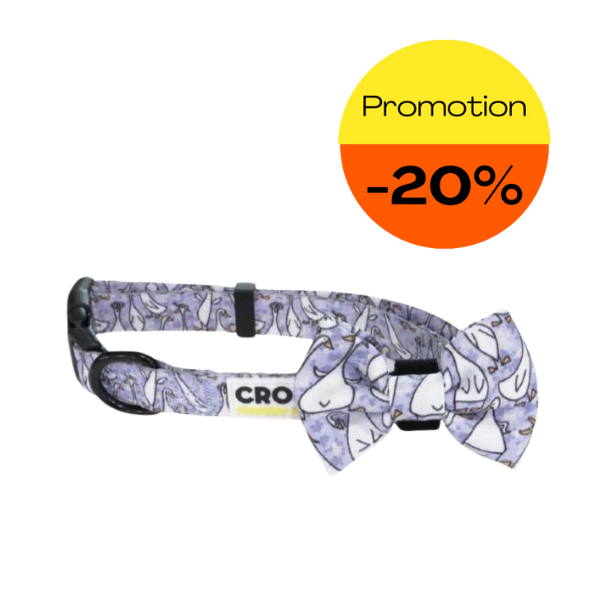 Le nœud papillon et la bandoulière sont agrémentés d'un joli motif de canards blancs sur fond lavande.