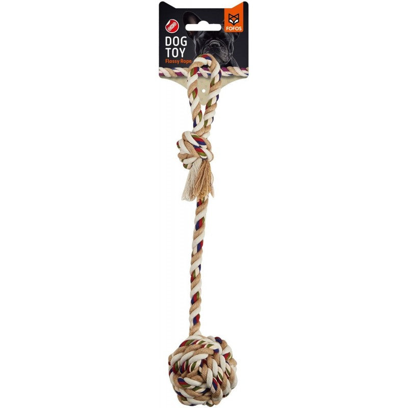 Jouet en corde à poignée avec une balle en corde au bout. Corde mélangée avec des morceaux de tissus.