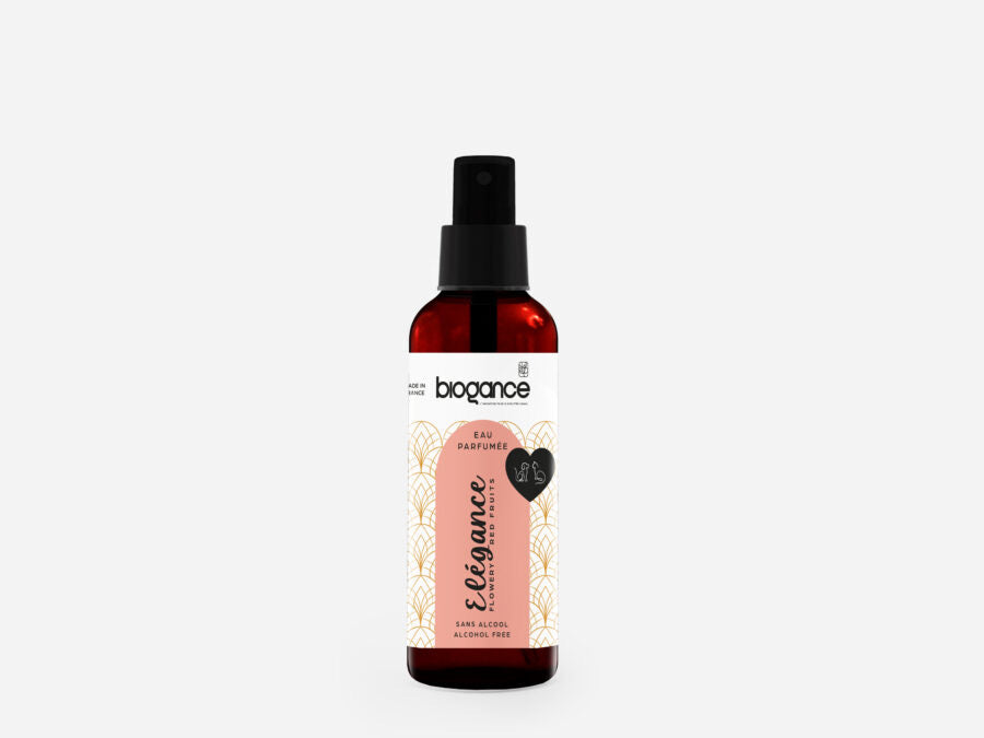Le parfum aux fruits rouges, sans alcool Élégance pour chien et chat est formulé à base de lila, jasmin, iris, fruits rouges, vanille et musc. Il offre un bouquet floral blanc rehaussé d’une note sucrée de fruits rouges.