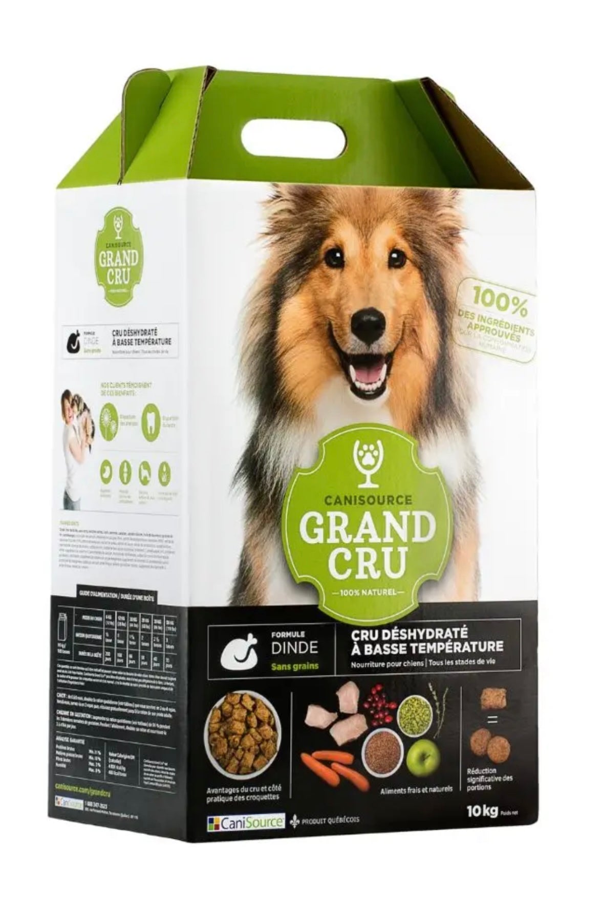 Dinde, foie de dinde, pois verts, lentilles vertes, lupin, pommes, carottes, patates douces, huile de tournesol, graines de lin moulues, canneberges, carbonate de calcium, phosphate tricalcique, thym, extrait de saccharomyces cerevisiae (MOS), extrait de racine de chicorée (FOS), extrait de betterave, extrait de sureau, extrait de levure, extrait de lactobacille, extrait de thym, niacinamide, chlorure de choline, zinc sulfate, sulfate ferreux, acide ascorbique (vitamine C), protéinate de zinc, protéinate de fer, supplément de vitamine E, pantothénate de calcium, mononitrate de thiamine, sulfate de cuivre, chlorhydrate de pyridoxine, riboflavine, supplément de vitamine A, oxyde manganeux, supplément de vitamine D3, protéinate de cuivre, protéinate de manganèse, iodate de calcium, acide folique, sélénite de sodium, biotine, supplément de vitamine B12, acide citrique, extrait de romarin.