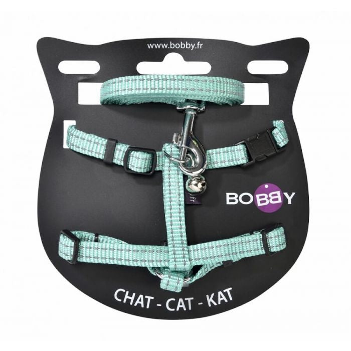 Le Kit Harnais + Laisse Safe de chez Bobby consiste en un harnais accompagné d'une laisse à grelot, en nylon, de couleur et surpiqué d'un point sellier réfléchissant pour davantage de visibilité lors des ballades nocturnes.