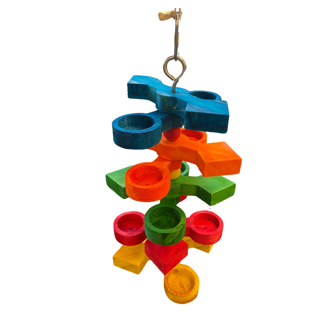 Jouet à suspendre avec coupelles intégrées et flèches pivotantes afin d’y cacher les friandises favorites de votre oiseau. De quoi l’occuper un bon moment.