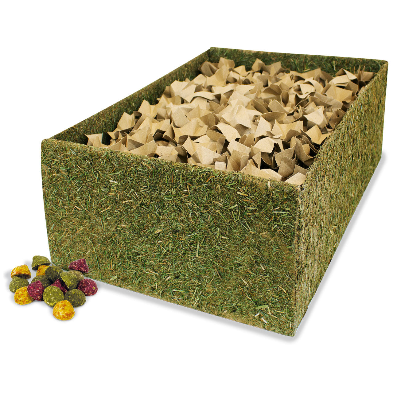 Bac de fouille en carton pour lapin/rongeur. Garni de papier cartonnés, entièrement comestible. Premières friandises fournies.