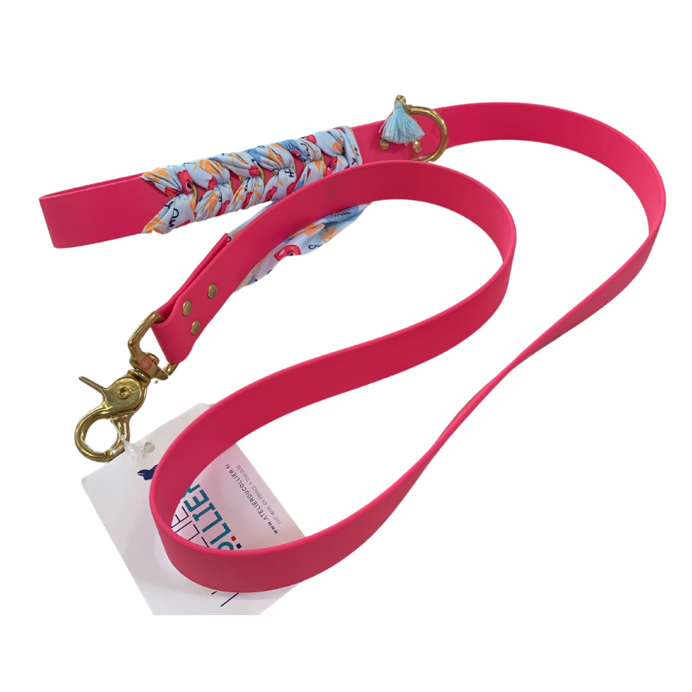 Laisse en biothane, rose avec un bandana aux motifs colorés. Avec poignée.