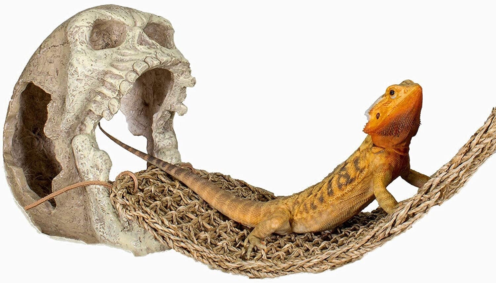 En plus, d'être très décoratif, le crâne et le filet d'escalade peuvent être placés stratégiquement pour permettre au reptile d'atteindre les points chauds en hauteur. Ainsi, n'hésitez pas à ce produit sous une lampe chauffante (protégée) pour permettre à votre animal de se réchauffer à température optimale au point chaud.