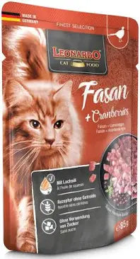 Aliment complet pour chats adultes • Faisan + Canneberges • Composition : poulet (coeur, foie, gésier) (37%); viande de faisan (30 %); bouillon de viande de poulet et faisan (29,8%); canneberges (2%); coquilles d'œufs séchées (0,5%); substances minérales (0,5%); huile de saumon (0,2%).