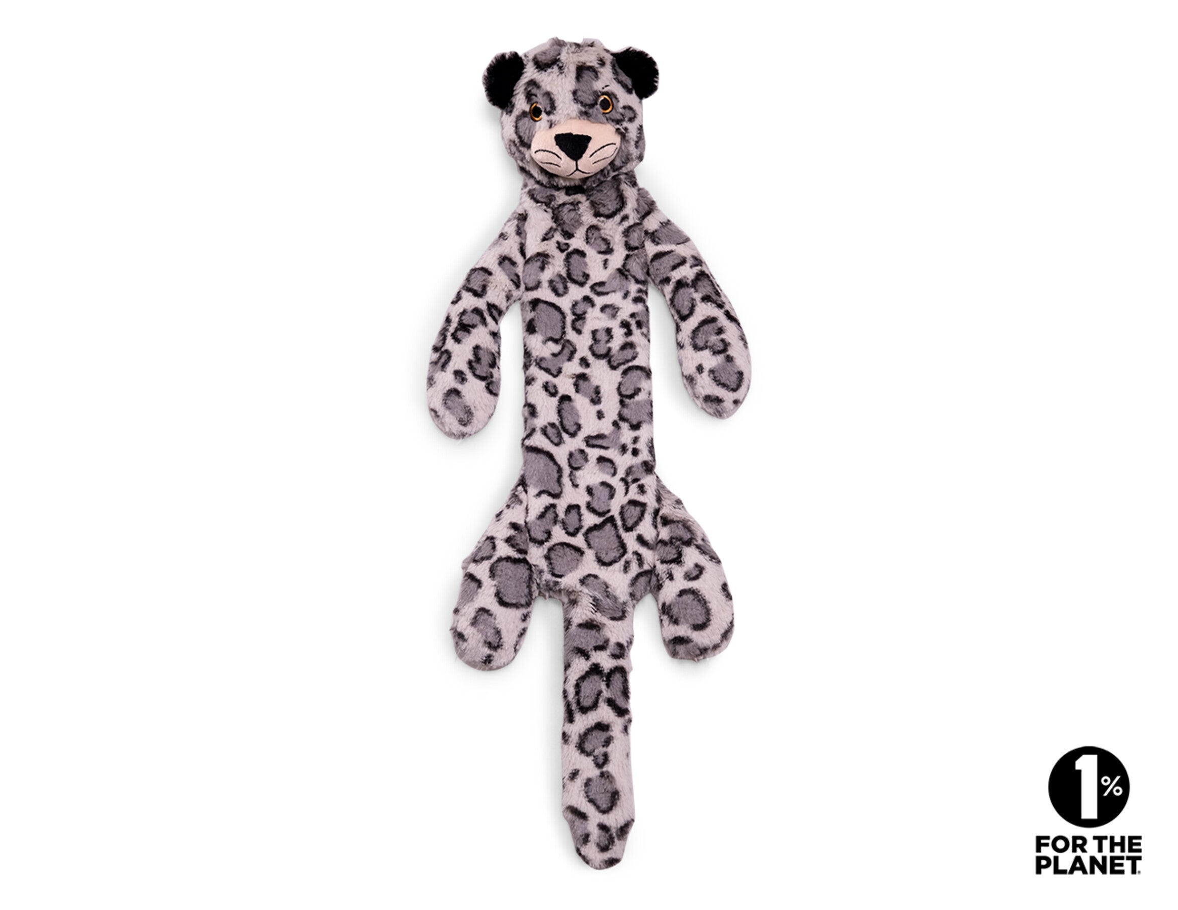 Peluche panthère des neiges 50 cm. Couine et fait un bruit de papier qui bruisse.