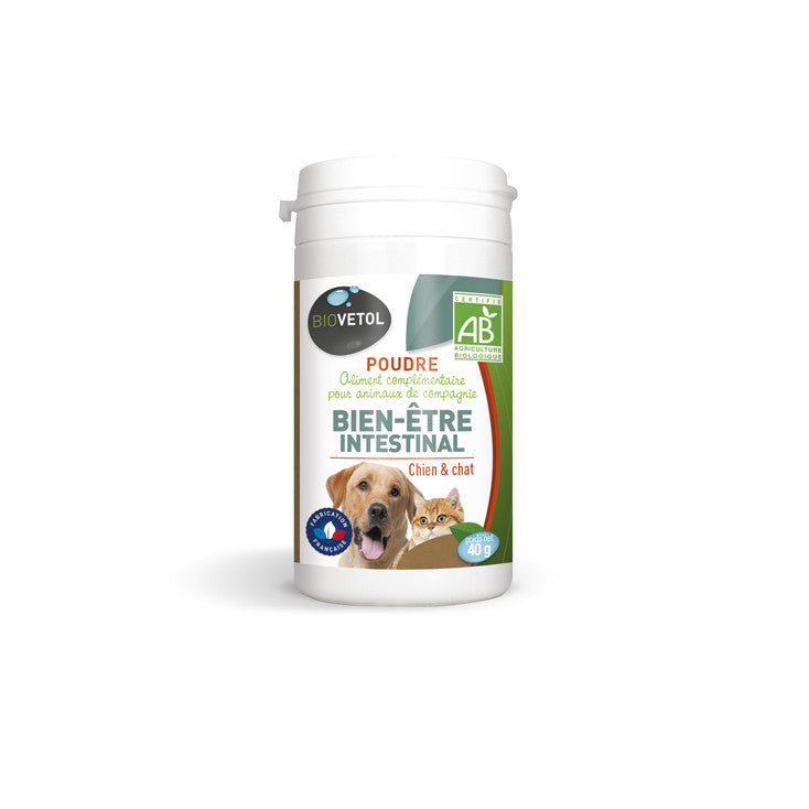 Aliment complémentaire pour chien et chat (à partir de deux mois) à base de plantes et d’extraits de plantes pour enrichir l’alimentation de base de l’animal, notamment en fibres digestives, favorisant le maintien de la flore intestinale et à l’aide au maintien d’un fonctionnement normal de l’intestin.