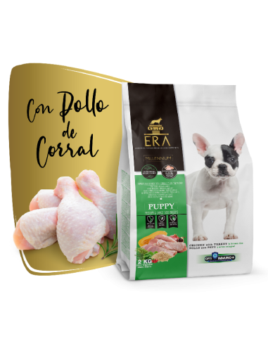 ERA Millennium poulet et dinde pour chiots de race moyenne est un aliment complet et équilibré pour les chiots de race moyenne (10-25 kg) et leurs mères allaitantes. Sa formule exclusive confère à la recette une teneur élevée en protéines et un mélange soigné d'ingrédients fonctionnels qui aideront votre chiot à avoir une croissance optimale et saine. Le poulet et la dinde ERA Millennium pour chiots de race moyenne contiennent 65 % d'ingrédients d'origine animale et de la viande de poulet fraîche désossée comme ingrédient principal, ce qui lui confère une haute digestibilité et une excellente saveur. Le produit contient du riz brun et de la patate douce, qui apportent de l'énergie avec un faible indice glycémique, et des sources naturelles d'oméga 3 et 6, qui contribuent au maintien d'une bonne santé mentale, d'une peau saine et d'un pelage brillant. En complément, des fruits et légumes sélectionnés, riches en antioxydants naturels (polyphénols et caroténoïdes). De même, les probiotiques et prébiotiques contenus dans les recettes contribuent au maintien d’une bonne santé intestinale et contribuent à renforcer le système immunitaire. Avec les recettes de la gamme ERA Millennium vous couvrirez 100% des besoins nutritionnels de votre chien, ce qui non seulement profitera à sa santé, mais le ravira également grâce à ses saveurs intenses et délicieuses. Les inclusions élevées de viande fraîche et l'incorporation de foie de poulet hydrolysé, à l'exception des recettes à base de saumon et de hareng, contribuent à une plus grande appétence. Les recettes de la gamme ERA ne contiennent pas d'arômes artificiels. La gamme ERA Millennium est si exclusive car elle utilise des ingrédients de haute qualité, produits selon un seul processus thermique, et une sélection d'ingrédients fonctionnels appelés OptiImmuno+ dont il a été prouvé qu'ils procurent des bienfaits pour la santé, aidant le corps à fonctionner correctement et à mener une vie saine. plus sain, et donc favoriser la santé de votre chien.