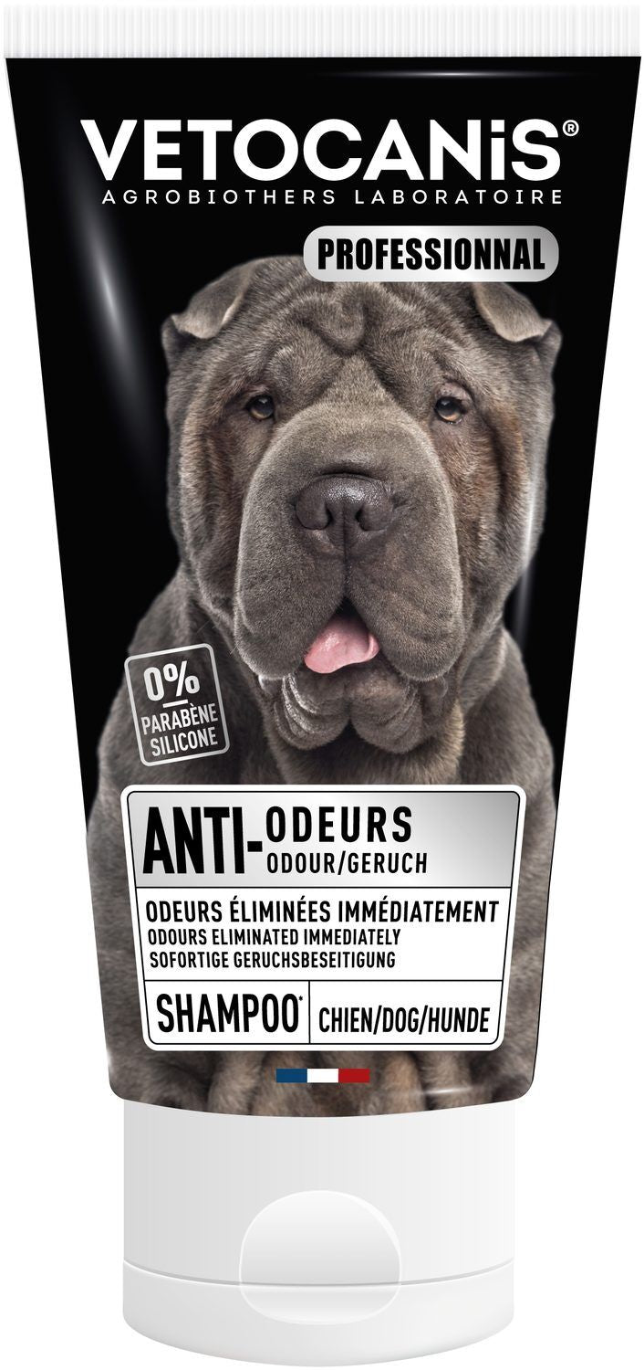 SHAMPOOING CHIEN ANTI-ODEURS - Propriétés : Ce shampooing a spécialement été conçu pour les chiens dont la flore naturelle de la peau sécrète trop de molécules malodorantes. L'efficacite dès la première utilisation repose sur la présence de probiotiques naturels qui vont dégrader ces différentes molécules responsables des mauvaises odeurs. L'effet longue durée est renforcée par le camphre aux propriétés désodorisantes. Convient a tous types de pelage et toutes longueurs de poils
