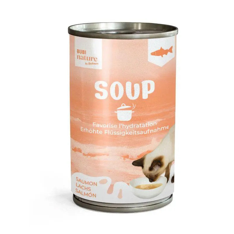 La soupe Bubimex à base de filet de saumon et de bouillon est idéale pour aider les chats à s’hydrater tout en mangeant, ce qui optimise leurs fonctions rénales.