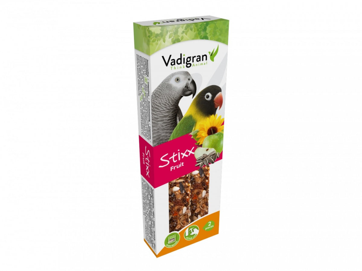 Les baguettes à ronger Vadigran StiXX pour perruches et perroquets avec fruits sont des aliments complémentaires sains et délicieux pour vos oiseaux. Les StiXX Vadigran sont des friandises naturelles cuites au four telles des pâtisseries et sont composées de divers ingrédients enrobés d'un délicieux biscuit. Facile à clipser à votre cage grâce à son attache en plastic, ils possèdent un coeur en bois naturel que vos oiseaux pourront picorer autant qu'ils le veulent en toute sécurité. Ils sont également idéaux pour l'usure naturelle du bec. Disposez toujours un stiXX dans la cage pour que votre oiseau de compagnie puisse profiter d'une vie active. Sans sucres àjoutés, ni colorants ni conservateur, ces délicieuses friandises au four feront le bonheur de vos petits gourmands.