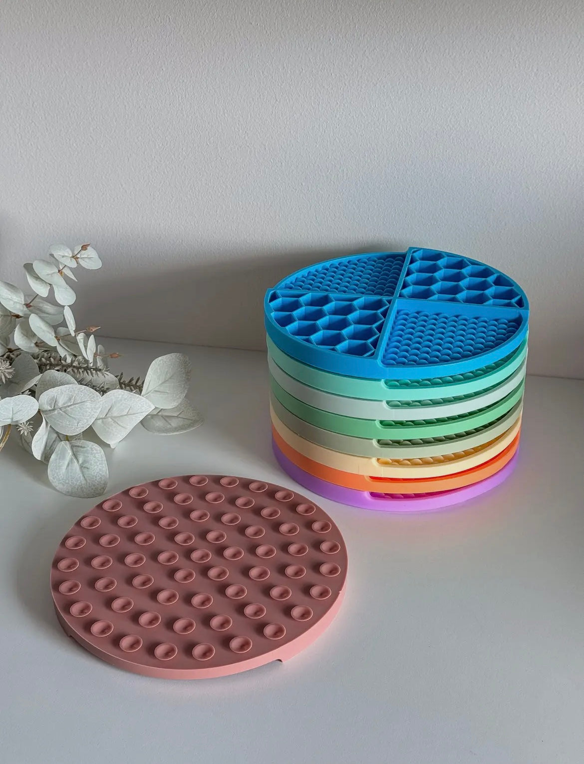 Tapis de lèche en silicone à double niveau ce qui permet de varier les difficultés avec un seul produit.