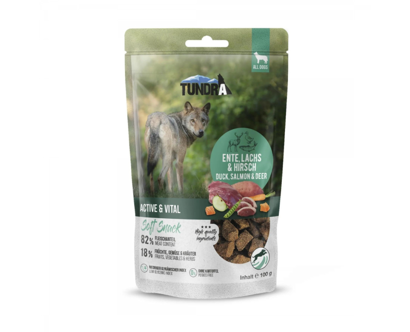 Les friandises TUNDRA Snaks Active & Vital sont une combinaison exquise de trois viandes brunes et particulièrement savoureuses pour votre chéri. 83% de viande, en combinaison avec des fruits et des légumes, est un régal sain. La formule sans céréales est riche en acides aminés et en antioxydants naturels et soutient la vitalité de votre chien !