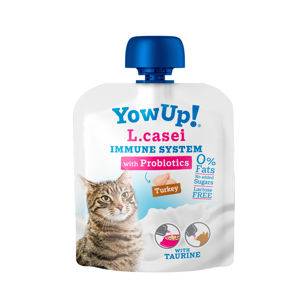 Produits laitiers fermentés (yaourt sans lactose) 90%, amidon de maïs, dinde désossée 3%, pectine, fructo-oligosaccharides 0,5% et Lacticase bacille casei (bactéries inactives encapsulées) 0,04 %. Additifs : Arômes et additifs nutritionnels/kg : Vitamine E (3a700) 200 UI, Taurine (3a370) 400 mg, Vitamine D3 (3a671) 50 UI et acide folique (3a316) 50 mg.